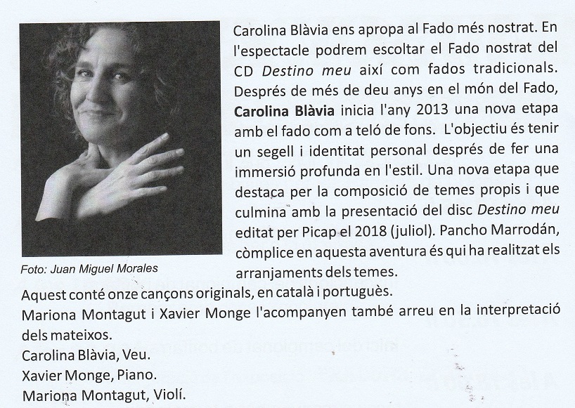 Carolina Blàvia presentar el seu nou treball discogràfic. Després de més de deu anys en el món del Fado, Carolina Blàvia inicia l’any 2013 una nova etapa amb el fado com a teló de fons. L’objectiu és tenir un segell i identitat personal després de fer una immersió profunda en l’estil. Una nova etapa que destaca per la composició de temes propis i que culmina amb la presentació del disc Destino meu. Aquestconté onze cançons originals, produïdes i arranjades per @panchomarrodan.Temes cantats en català i portuguès.
